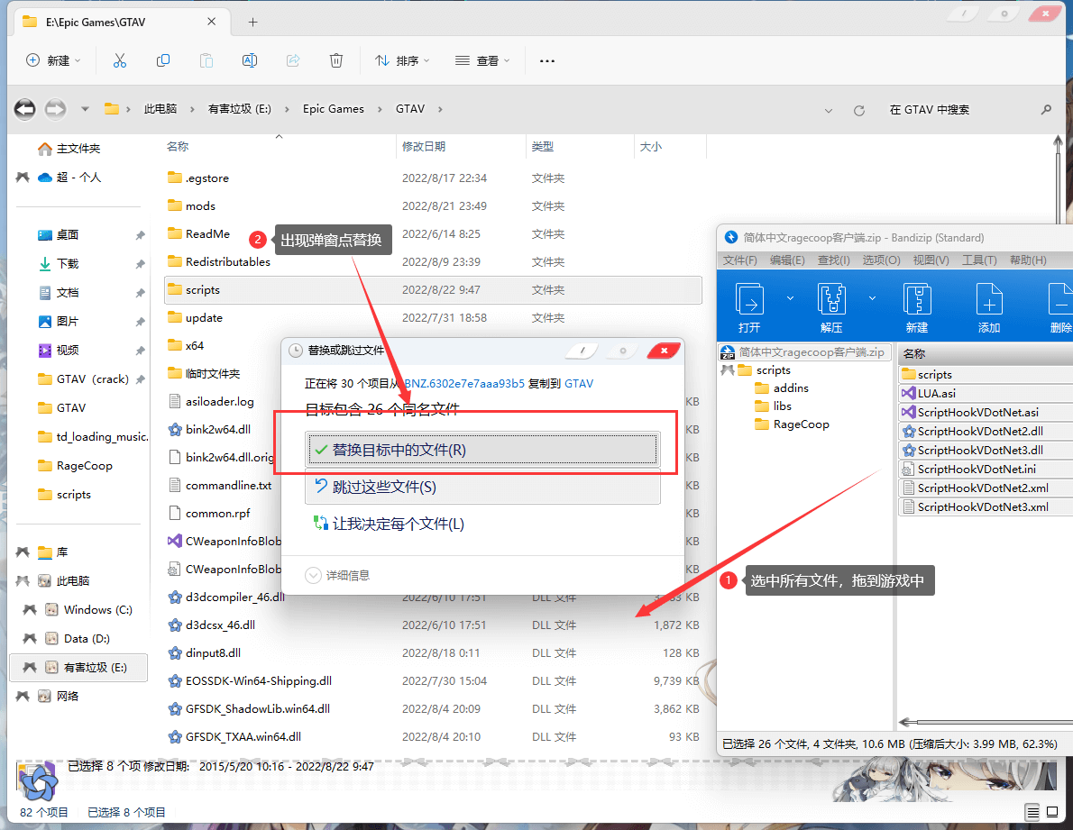 - 将压缩包中的所有文件拖到游戏目录中去,如果出现弹窗点替换即可(游戏目录就是你的GTA5.exe所在的位置)