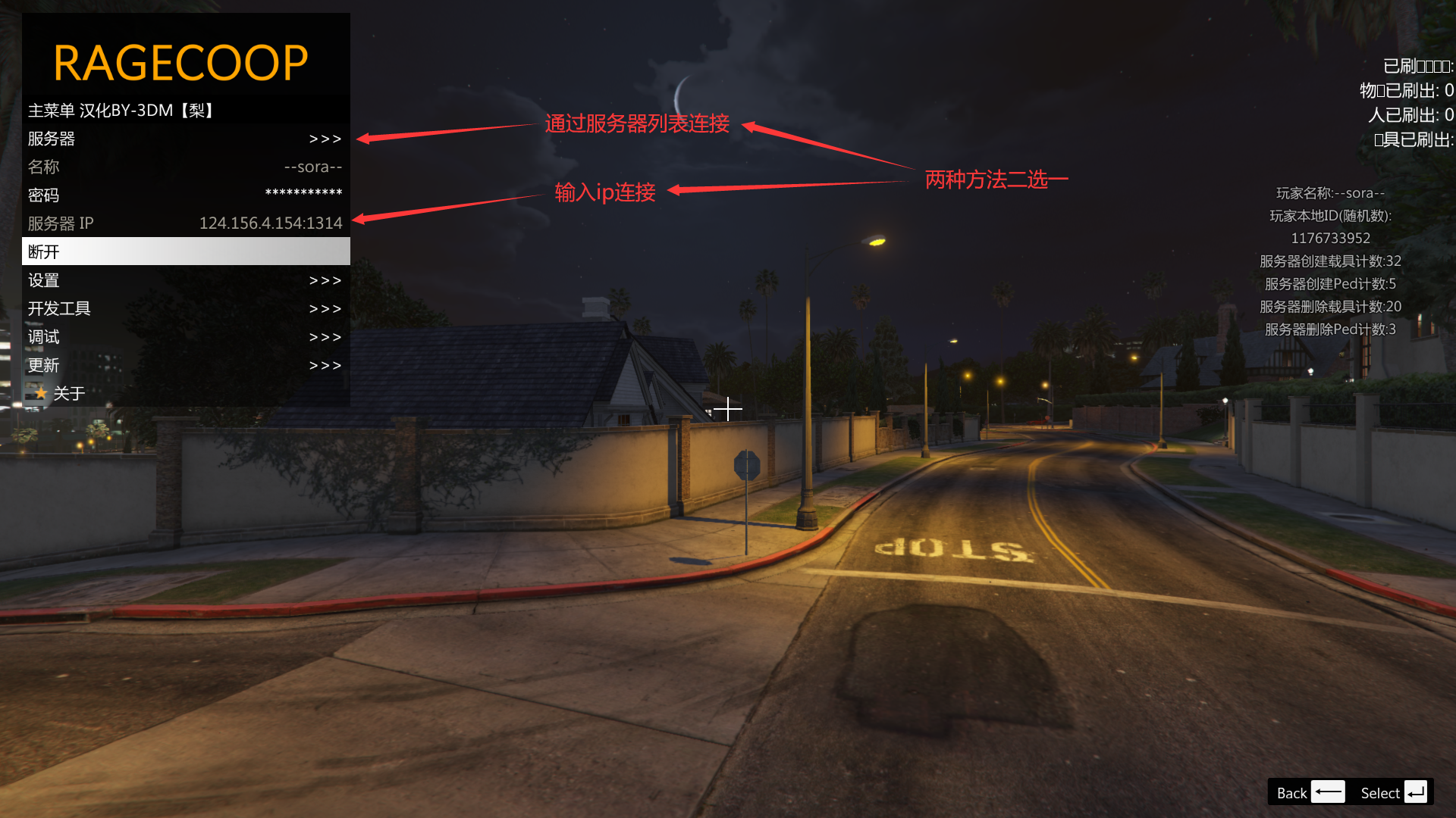 - 进入游戏按F9打开客户端,然后有两种连接方式,一个是通过服务器列表连接,在服务器列表中选择合适的服务器进行连接即可(推荐服务器–sora–和木偶服);另一个方法是通过输入服务器ip来连接,在ip处输入服务器ip地址,然后进行连接(我的服务器ip:124.156.4.154:1314),连接成功后左下角会出现一个绿色等的connect